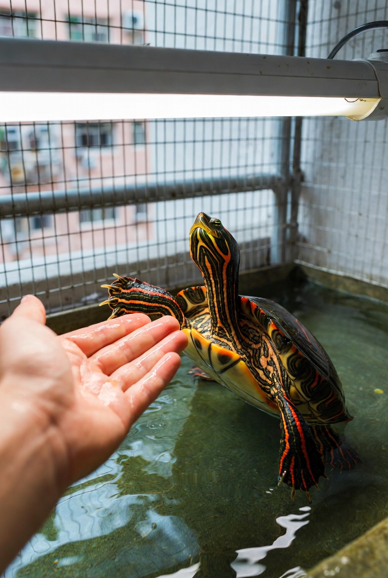 當主人伸手入缸,龜會主動游近+伸頸+張嘴(求撫摸),陌生人則會縮頭或游開。